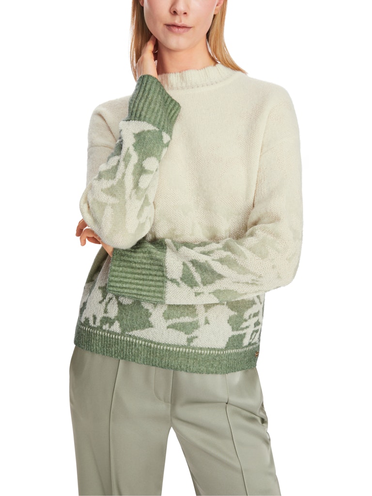 Floraler Sweater Knitted in Germany|Mit seinem floralen Silhouetten-Motiv im Farbverlauf zeigt dieser Sweater seinen besonderen Stil. Er hat einen lockeren Schnitt, der durch das Saumbündchen modelliert wird. Der Rundhals kommt mit verspielten Lochmuster-Design. Das Modell ist „Knitted in Germany“: Das Verstricken der Garne auf hochmodernen Strickmaschinen und die Veredelung der Stoffe geschehen am Standort Deutschland. Zusammengenäht werden die einzelnen Teile wie Ärmel, Vorderteil etc. in europäischen Partnerbetrieben.